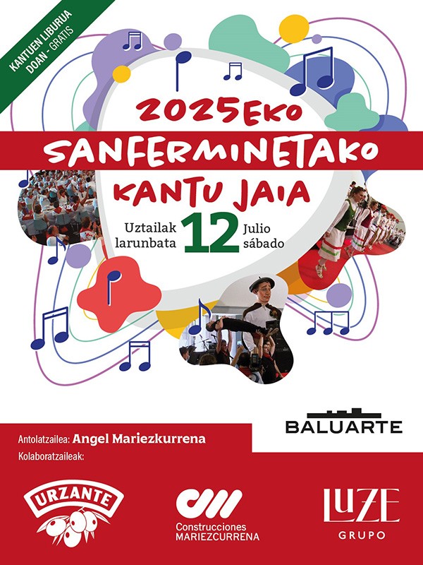 Sanferminetako Kantu Jaia 2025 estará amenizado por músicos, cantantes, dantzaris, joaldunes y gigantes. Con este evento, las personas que acuden a San Fermín desde fuera de Pamplona podrán conocer y disfrutar más de cerca las costumbres, cultura, canciones, bailes y, en definitiva, el ambiente "sin igual" alrededor de una mesa. El acto será abierto a todo público en general.