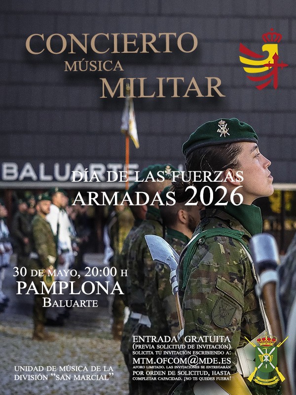 La Unidad de Música de la División "San Marcial" ofrece un concierto en Baluarte. Este evento, enmarcado dentro de las actividades complementarias del Día de las Fuerzas Armadas 2026, es una ocasión para acercar a la sociedad navarra la labor y el compromiso de las Fuerzas Armadas. El público asistente podrá conocer el trabajo y la dedicación de quienes velan por la seguridad y el bienestar del país.