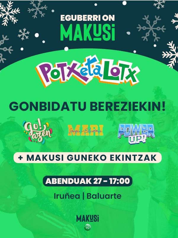 Los amigos y amigas del universo MAKUSI ofrecerán un espectáculo navideño muy especial en Baluarte, dirigido a público infantil y familiar. De la mano de los payasos Potx eta Lotx, traerán al escenario de la Sala de Cámara diversas peripecias, aventuras y vivencias. Además, tampoco faltarán las músicas, canciones y bailes, y todo inmerso en un ambiente navideño.