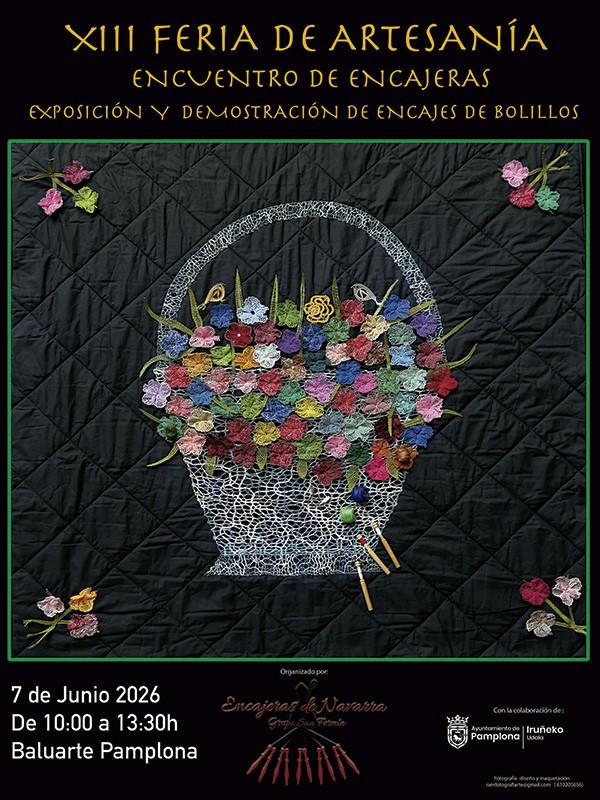 La XIII Feria de Artesanía - Encuentro de Encajeras tiene el doble objetivo mostrar al público qué es el encaje de bolillos y activar la afición por el encaje en Pamplona. Durante la jornada que tendrá lugar en Baluarte habrá exposición de encajes de bolillos realizados por las personas integrantes de la Asociación de Encajeras de Navarra; trabajos realizados por la profesora francesa “Arzhela Le Maitre” (cluny) que acude a Pamplona a dar cursos; 12 puestos con materiales específicos para poder hacer encajes y demostración de unas 500 encajeras trabajando, provenientes de diferentes puntos de España.